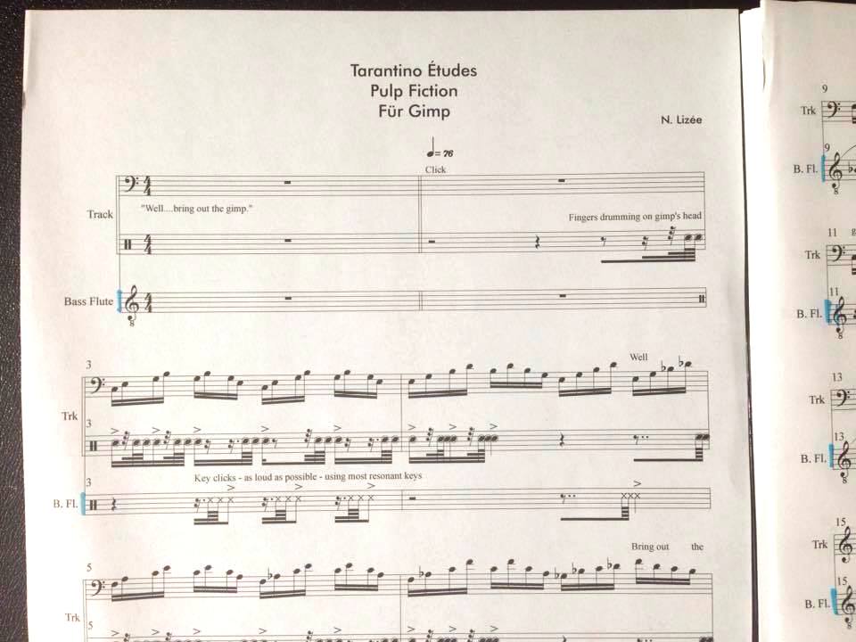 As Nicky and I started talking about this new commission in more detail, I knew she was in the midst of composing a series of pieces that explored the works of particular film directors — she called these her “Criterion Collection”. Lizée’s music is infused with tributes to popular culture, whether it be film (Hitchcock, Kubrick), music (Rush, DJ turntable art), or even toys (those of us born in a certain age will remember the Omnichord or the electronic game “Simon”, both of which have made appearances in Lizée’s music). She remains unique in her ability to create music that is chilling, funny, and occasionally flat-out demented while referencing iconic moments of 20th century popular culture — this is new music steeped in 70s/80s pop nostalgia. So I was surprised when she proposed that her new piece for bass flute and glitch would pay tribute to the work of Quentin Tarantino — a cultural phenomenon firmly rooted in the 90s/21st century. I should probably clarify that: when I say “surprised” I mean “peel-me-off-the-ceiling excited”, not just because Tarantino is one of my all-time favourite film directors, but because so many aspects of his style — the juxtaposition of humour and violence, soundtrack-driven narratives, a love of pop culture iconography — are things that, I feel, resonate very strongly with Lizée’s music.